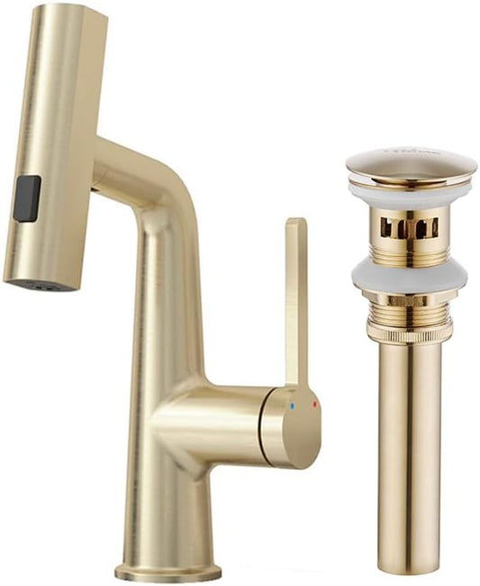Mopo Brushed Gold Waterfall Bathroom Faucet with Pull Down Sprayer and Sink Drain Set