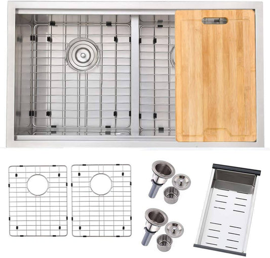 VENETIO 33" Brushed Nickel Stainless Steel Workstation Double Bowl Undermount Kitchen Sink, with Adjustable Dish Drainer & Dish Grid & Basket Strainer & Cutting Board