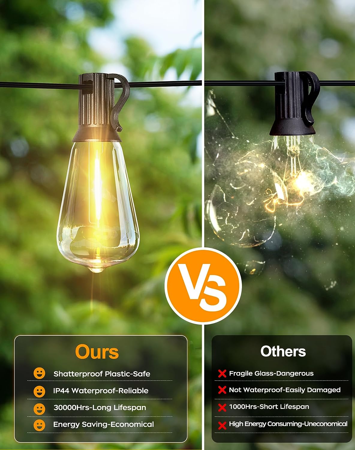 • 【Weatherproof and Safety】- Built with our weatherproof technology, these outside string lights can withstand rain, wind, snow, and extreme temperatures, so you can leave them outsides year-round without worries. The bulbs are made of hard anti-drop plastic, so you don't have to worry about broken glass shards. These safe and durable hanging lights come with a built-in spare fuse for easy replacement.