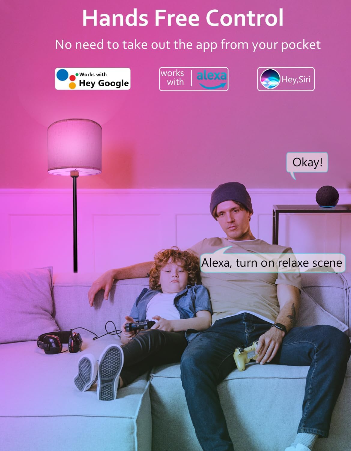 Control this smart floor lamp with Alexa, Google, Siri, or the remote. Save your favorite scenes, use the 60-second timer, and adjust color temperature. The Surplife app offers even more features for convenience and fun.