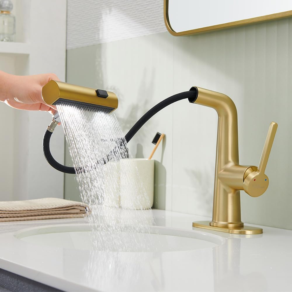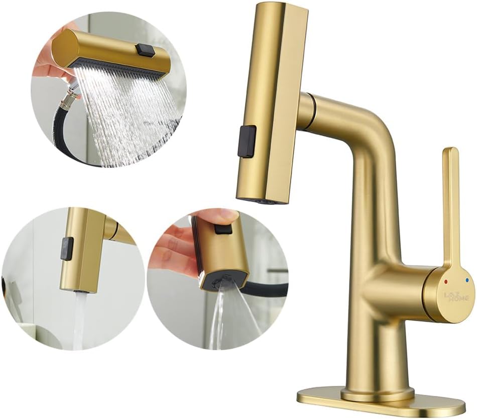 - Upgrade your bathroom with this brushed gold waterfall faucet featuring a pull down sprayer.