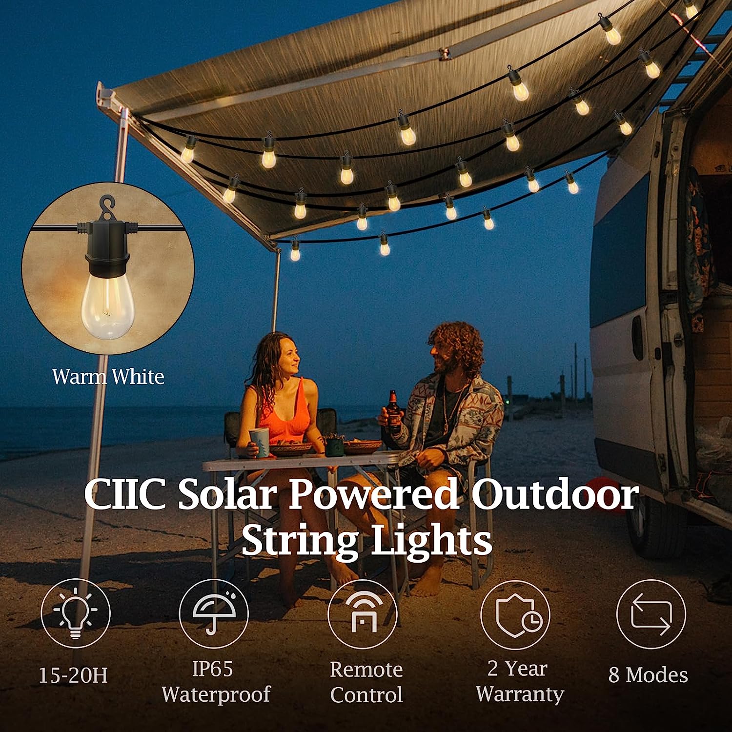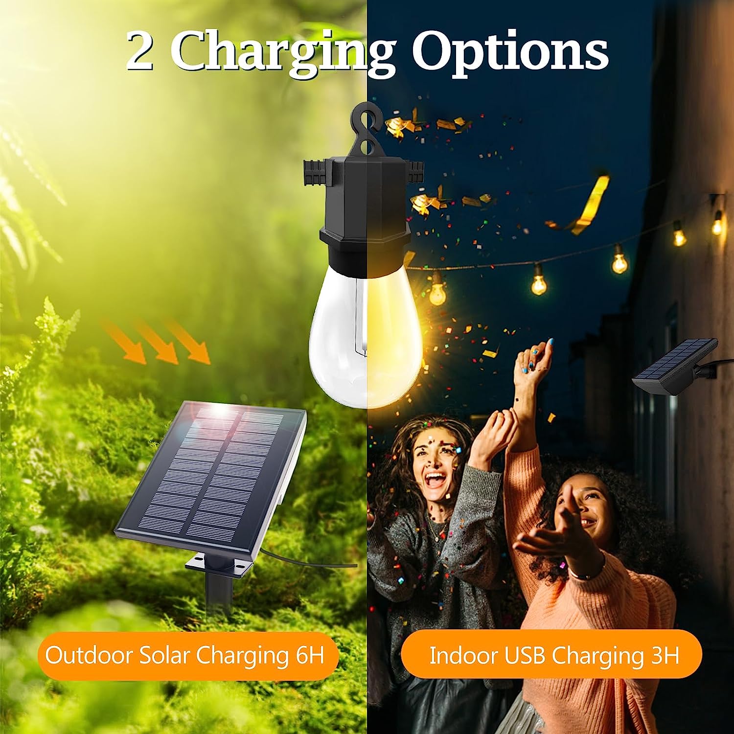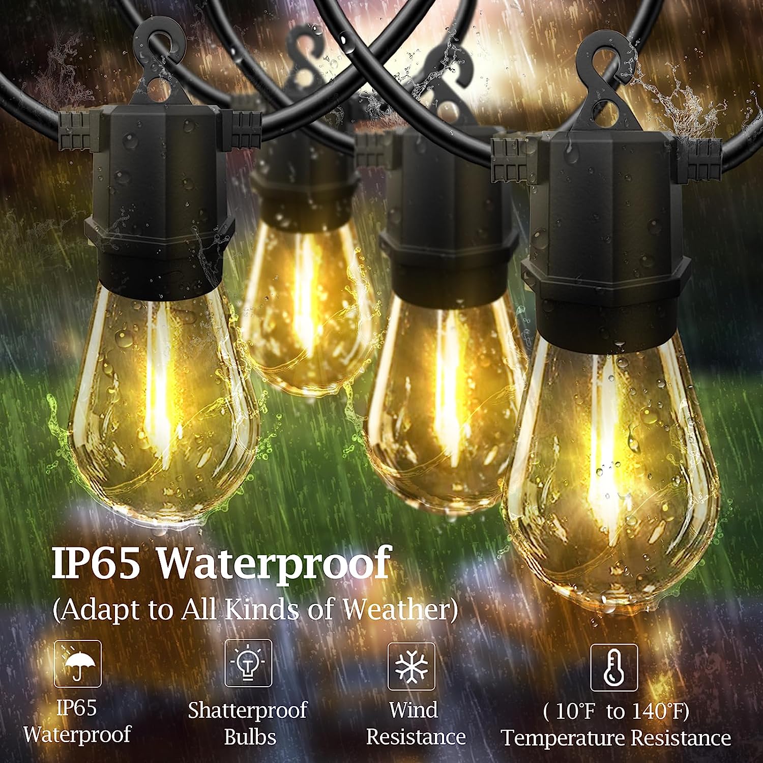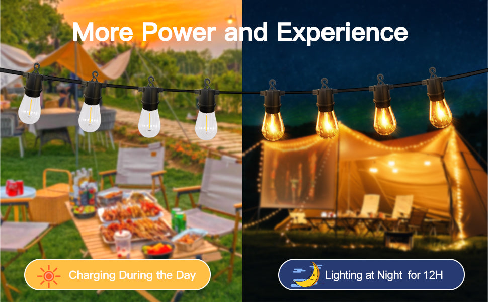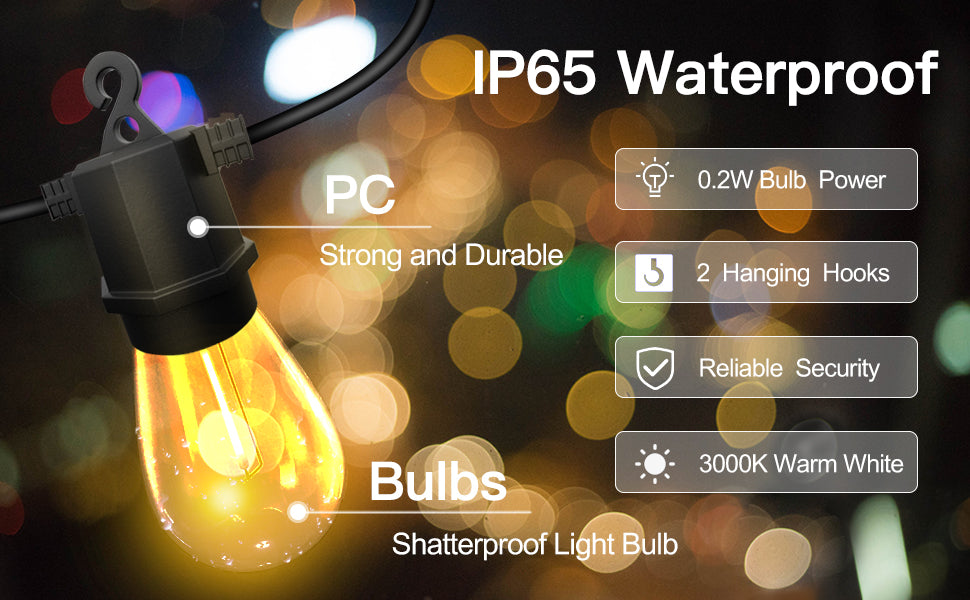 - IP65 PATIO LIGHTS OUTDOOR WATERPROOF——Outdoor solar string lights weatherproof can resist all kinds of rain and snow weather, light bulb strings and protective shell for ABS material, with the function of preventing leakage, prevent short circuit, protect you and your family and friends.