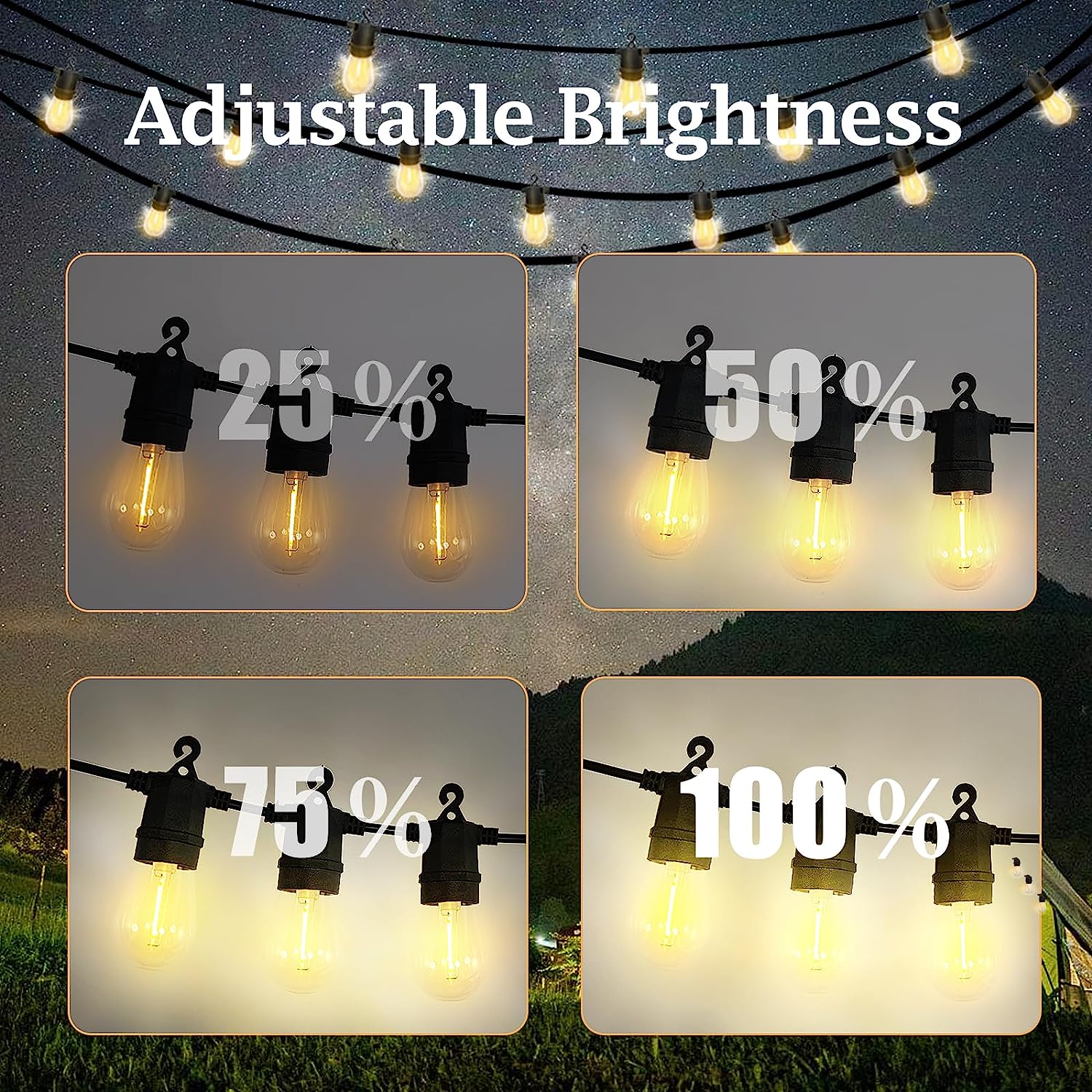 - DIMMABLE BRIGHTNESS &8 MODES——The remote can be adjusted to different brightness levels: 25%/50%/75%/100% to light up your yard party. The remote control can set the lighting time to 4/6/8Hrs and can control 8 different modes, so that your party has the perfect visual experience at night.