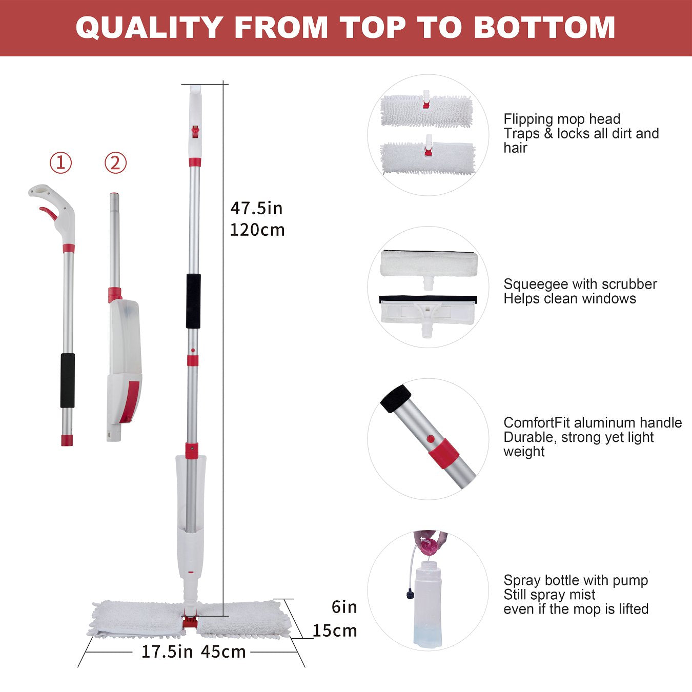 🏘️ EASY-TO-OPERATE — The 17.5''*6'' large, dual-sided microfiber mop head flips allowing you to damp mop your entire floors fast without changing or cleaning the pad. The spray bottle is easy to remove and fill and it sprays a fine mist over a larger area.
